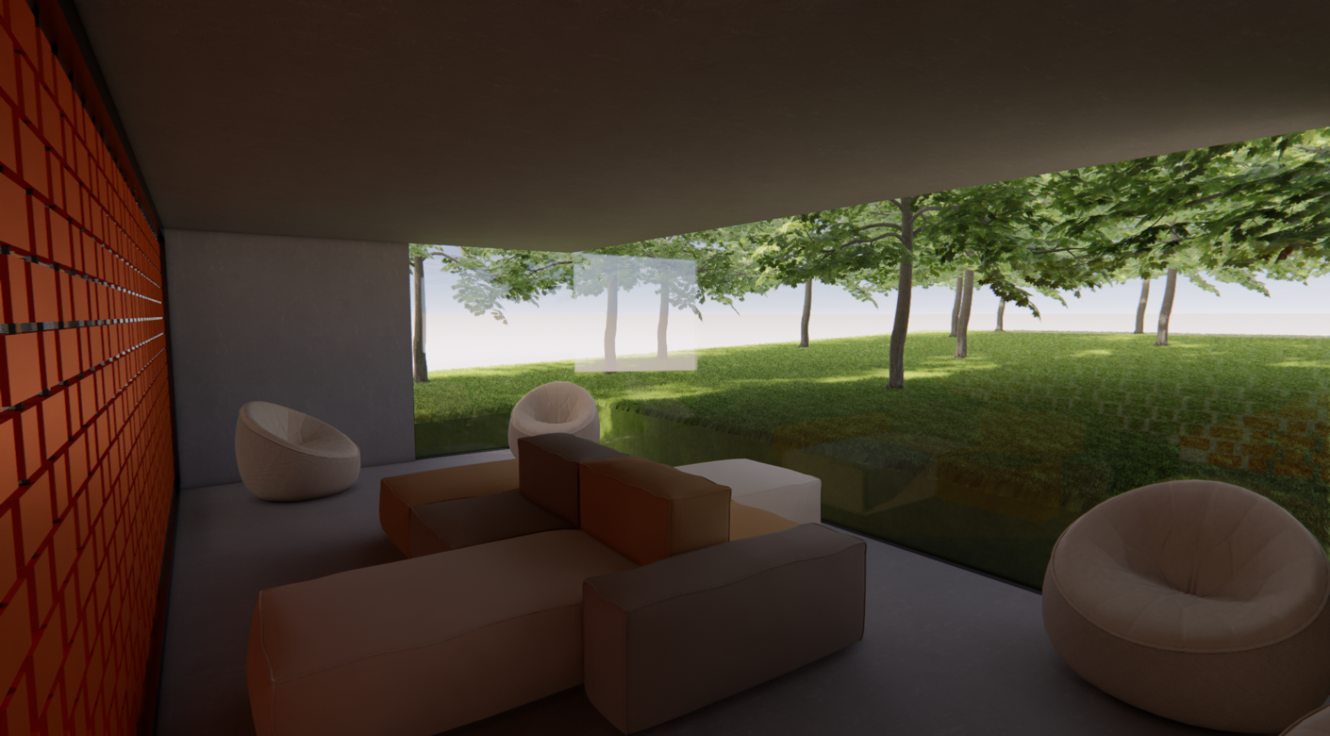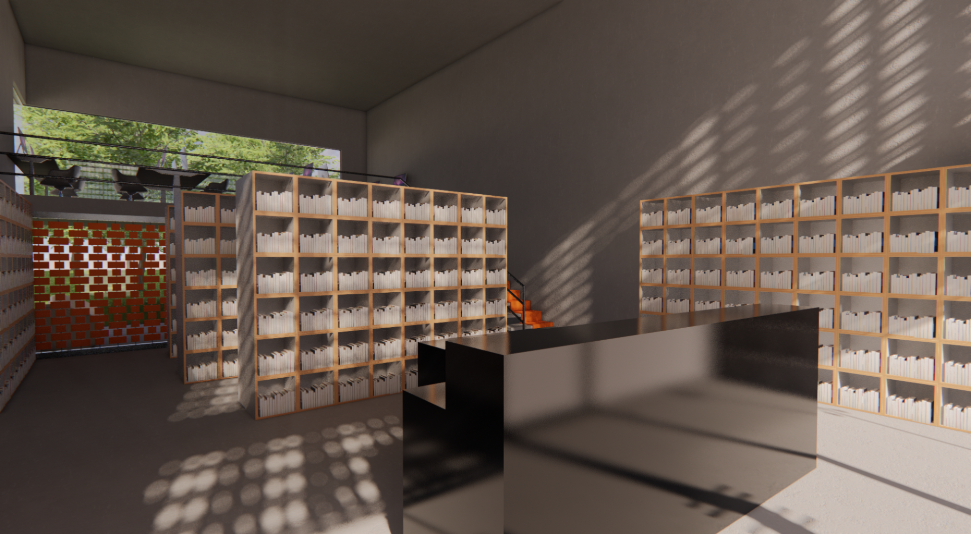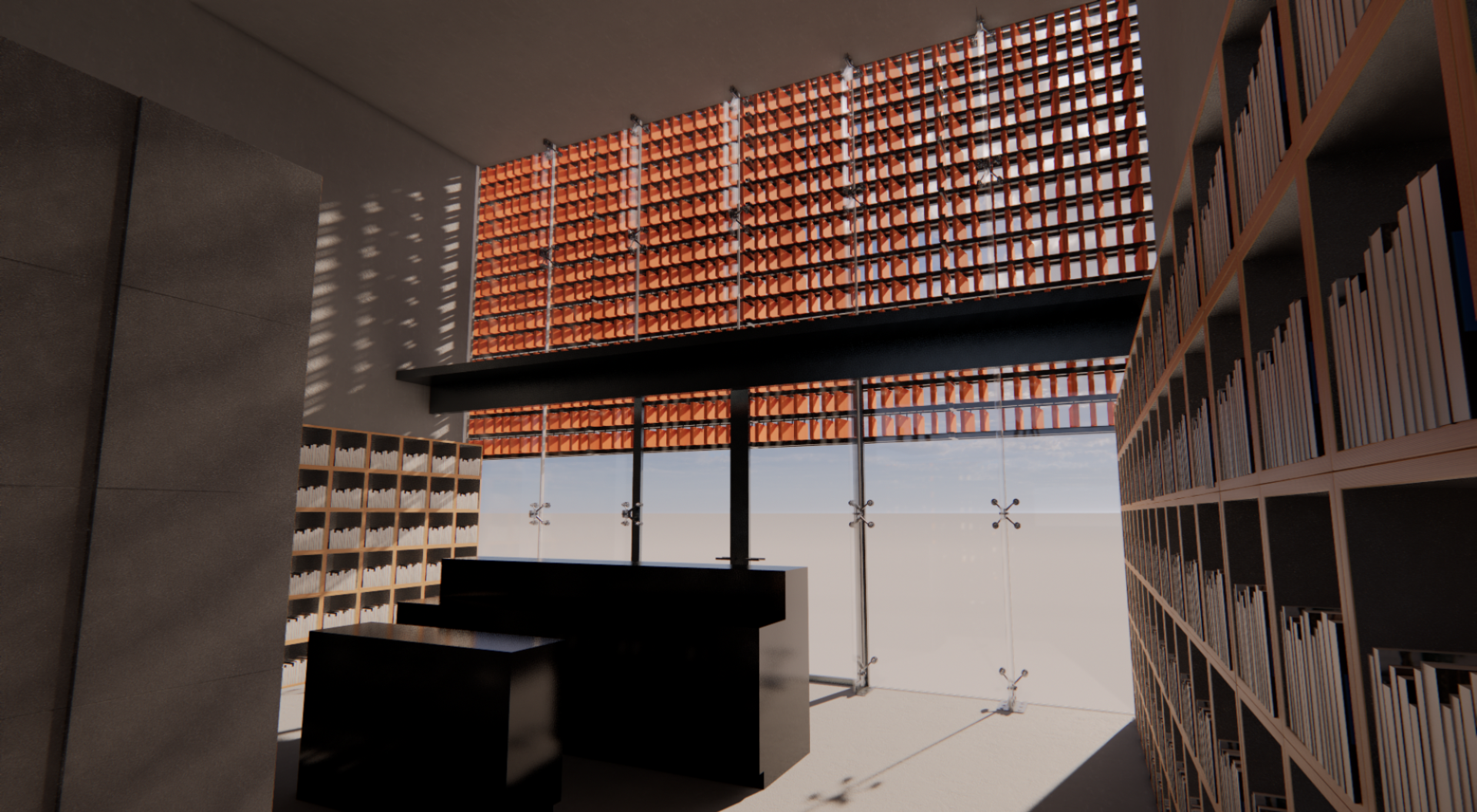 El segundo está ubicado en la fachada nor-oeste el cual acompaña el área de lectura y el área de computo, haciendo de estos espacios cómodos y amenos para el usuario, creando una conexión con el paisaje de árboles endémicos de la ciudad de Cuernavaca distribuídos al rededor del predio, generándole al usuario una sensación de estar trabajando/leyendo dentro de la naturaleza.